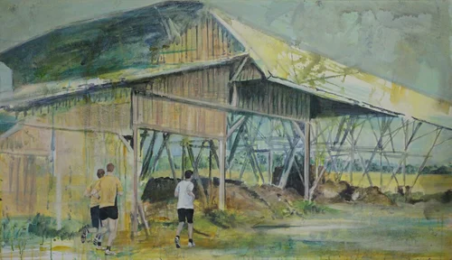 zeigt Landschaftsausschnitte, die in ihrer Gliederung und Struktur flächig abstraktes Arbeiten herausfordert. Eine Kulturlandschaft von Menschenhand geordnet, bearbeitet und genutzt, die fast überall in unserer Umgebung vorzufinden ist, gibt einen alltäglichen profanen Blick auf Landschaft, der als langweilig wahrgenommen wird. Allerdings für die Malerei in ihrer Reduziertheit höchst spannend sein kann, sowohl für die Frage der Komposition und für das Finden einer gelungen Bildlösung.